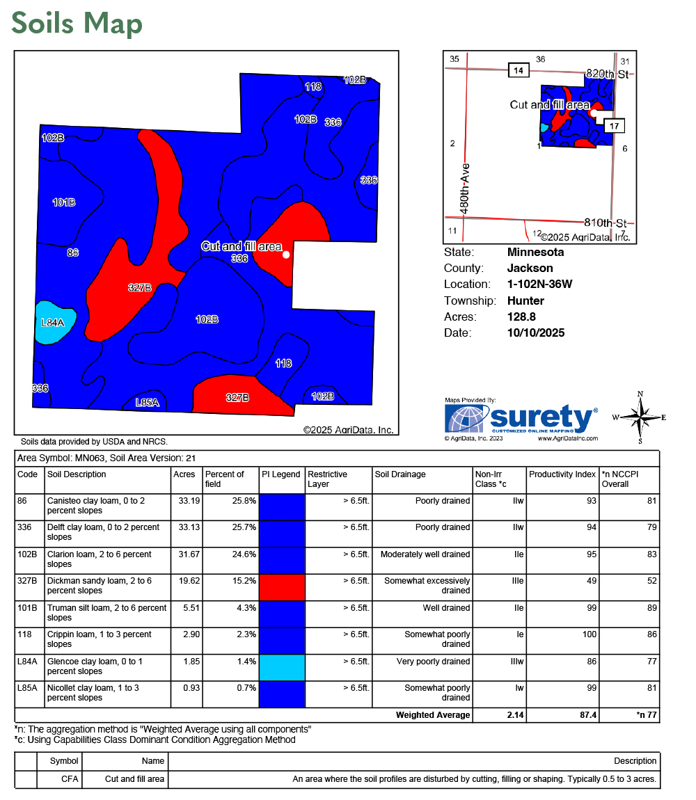 Nicollet clay loam, Delft clay loam, Canisteo clay loam, Clarion loam, Truman silt loam, Dickman sandy loam, Crippin loam, Glencoe clay loam. See soil map.
