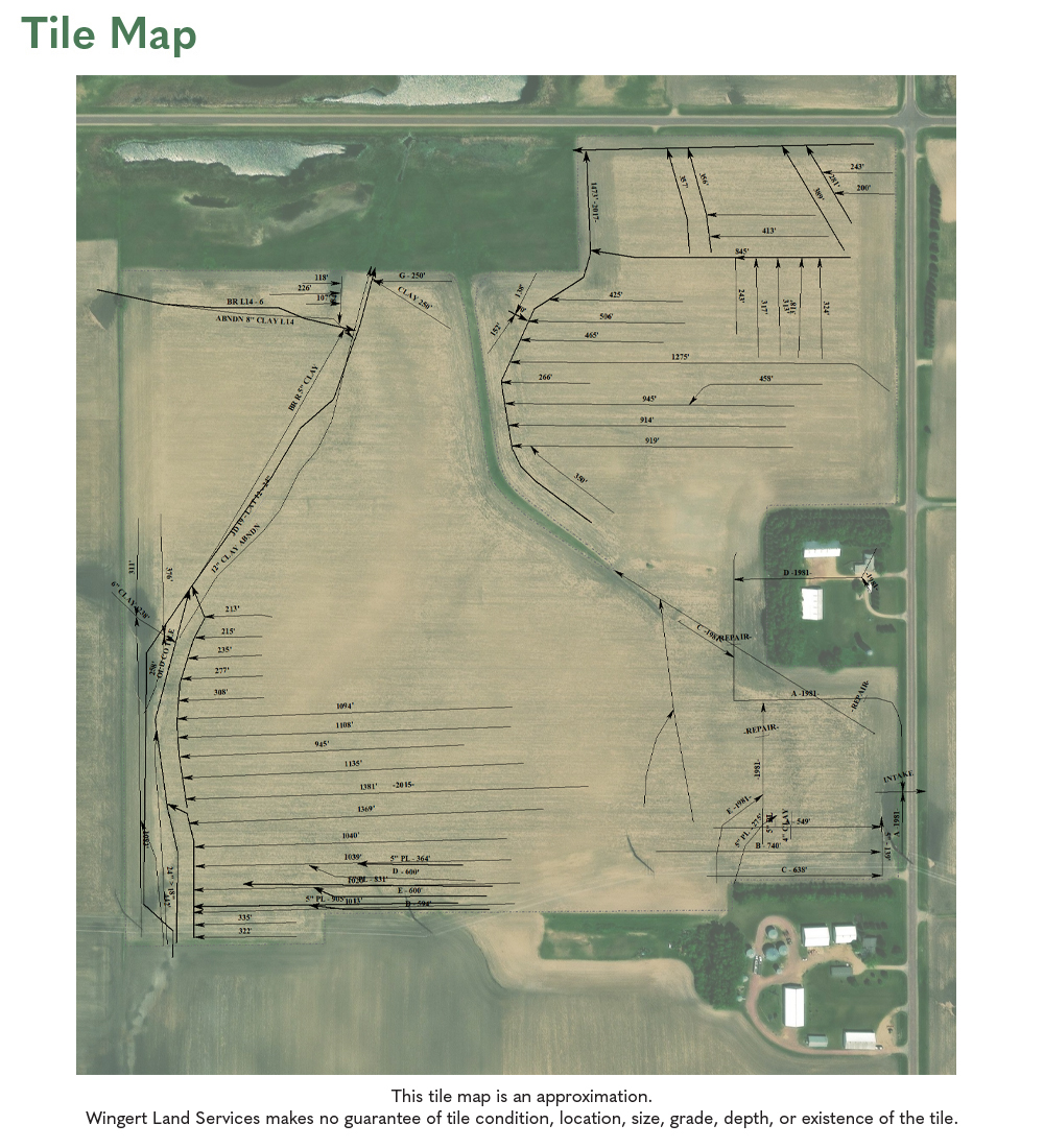 Outlets – JD19 (22" County Tile) and JD 20 (SE corner of property). Substantial system tiling. See Tile Map.