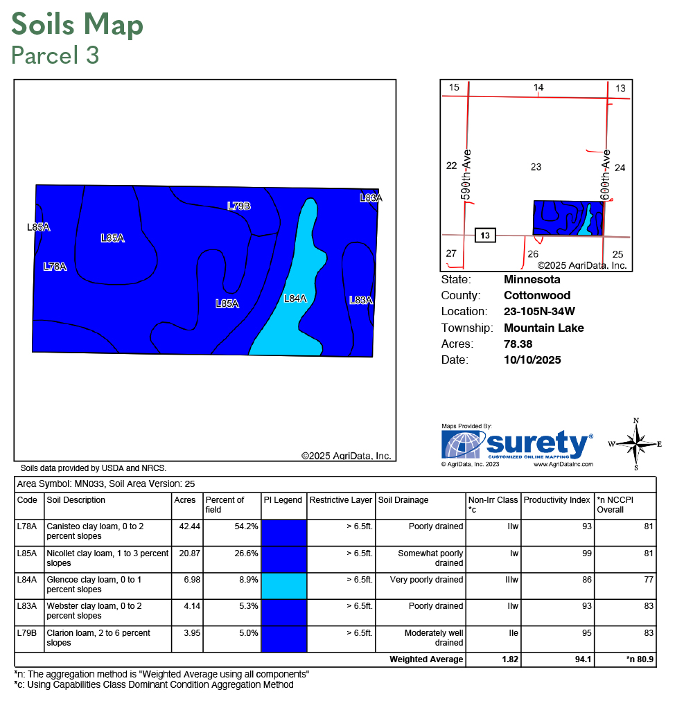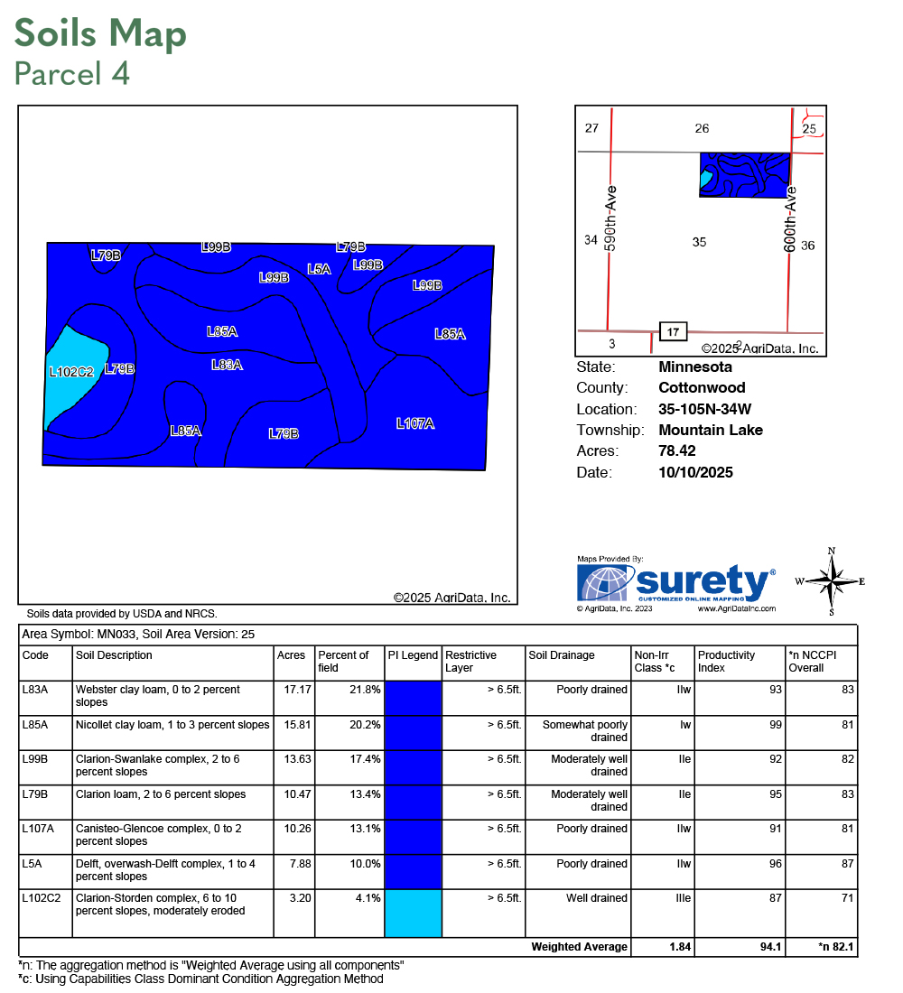 Nicollet clay loam, Clarion-Swanlake complex, Clarion loam, Webster clay loam, Canisteo-Glencoe complex, Delft, Calrion-Storden complex. See soil map.