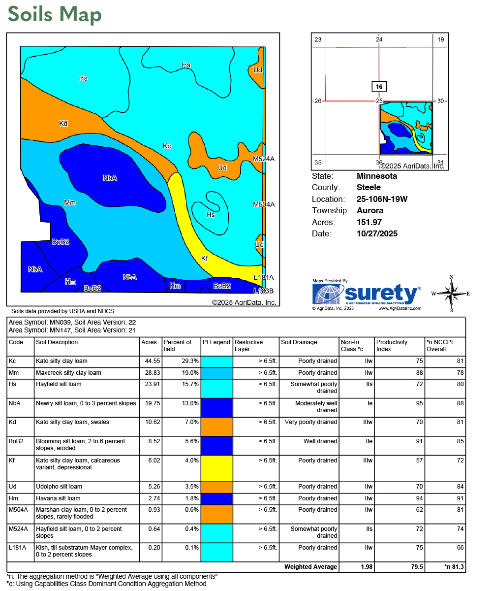 Kato silty clay loam, Maxcreek silty clay loam, Hayfield silt loam, Newry silt loam, Blooming silt loam, Udolpho silt loam, Kish. See Soils Map.