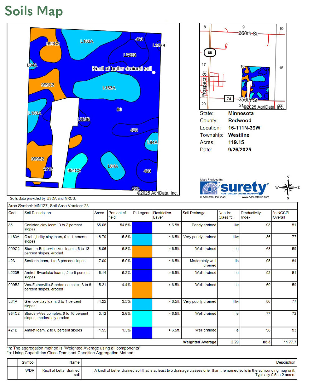 Canisteo clay loam, Okoboji silty clay loam, Storden-stherville-Ves loams. See Soils Map.
