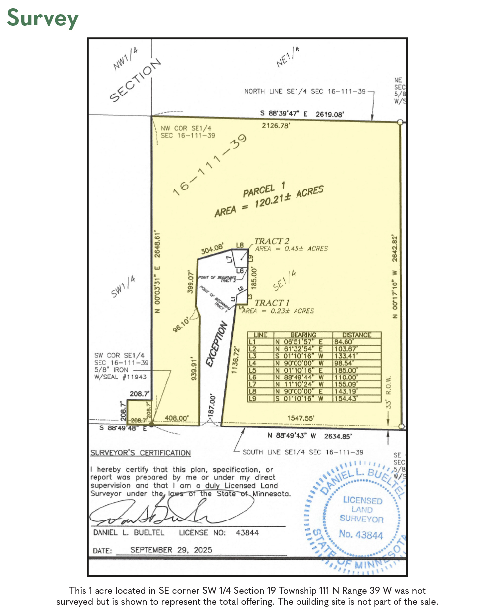 West 119.21± ac SE 1/4 and 1 ac in SE corner SW 1/4 Section 16 Township 111 N Range 39 W (Updated Abstract Legal to Govern). See updated legal survey.