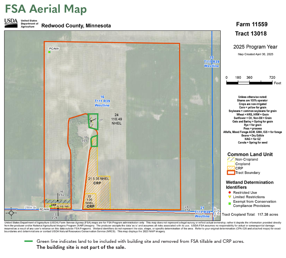 Due to building site survey, FSA acres will need to be redetermined. FSA Tillable, CRP and Base Acres are estimated.