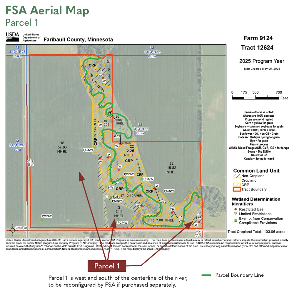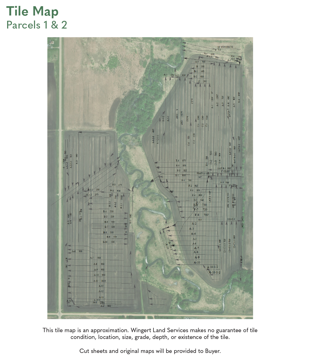 Buyer agrees as a condition to this sale, to enter into a drainage agreement with Seller, regarding a tile main serving Seller’s land and draining into the Maple River, located on Parcel 1. General terms of this agreement shall include: “a perpetual drainage and tile easement to Grantee for the purposes of installation, use, inspection, repair, maintenance, upgrade, replacement, and preservation of the Tile Line located on Grantor’s Property.” Please contact Geoff Mead with any questions.