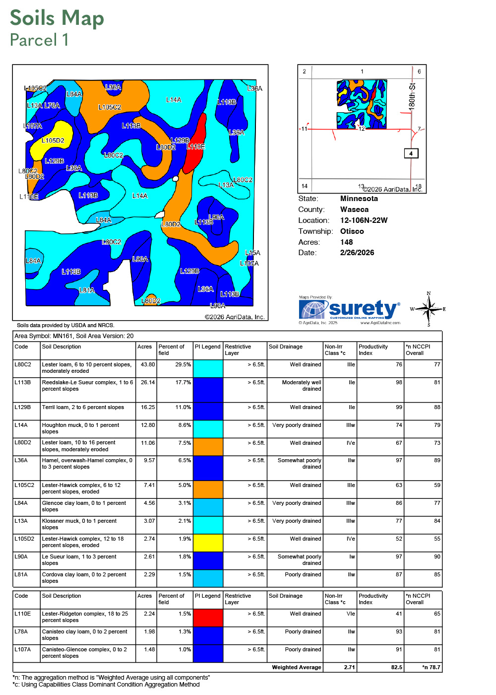 | Auction Format This auction will be offered in a multi-parcel plus combination format and will be offered as Parcel 1 (155.00± acres), Parcel 2 (5.00± acres), and Parcel 1+2 (160.00± acres). |