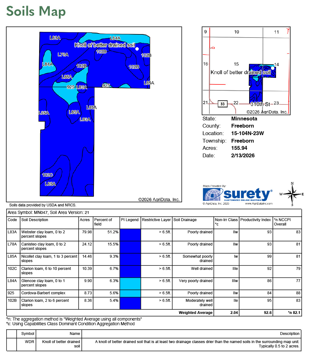 Webster clay loam, Nicollet clay loam, Clarion loam, Glencoe clay loam, Canisteo clay loam, Cordova-Barbert complex. See Soils Map.