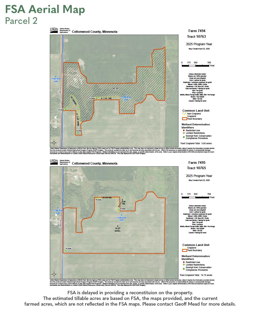 FSA is delayed in providing a reconstitution on the property. The estimated tillable acres are based on FSA, the maps provided, and the current farmed acres, which are not reflected in the FSA maps. Please contact Geoff Mead for more details.